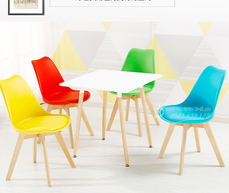 - 4 Ghế Eames chân gỗ GLM05 đã được trang bị thêm một lớp đệm bọc PU, tạo sự thoải mái cho người dùng. Kiểu dáng mẫu ghế lạ mắt, biến tấu bo tròn tạo nên độ mềm mại cho chiếc ghế, được làm từ nhựa PP nên Ghế Eames chân gỗ GLM005 có thể tự hào về độ bền chắc của mình. Chân ghế được làm bằng gỗ sồi với thiết kế lạ mắt, là một trong những điều riêng biệt của dòng ghế Eames từ trước tới nay.